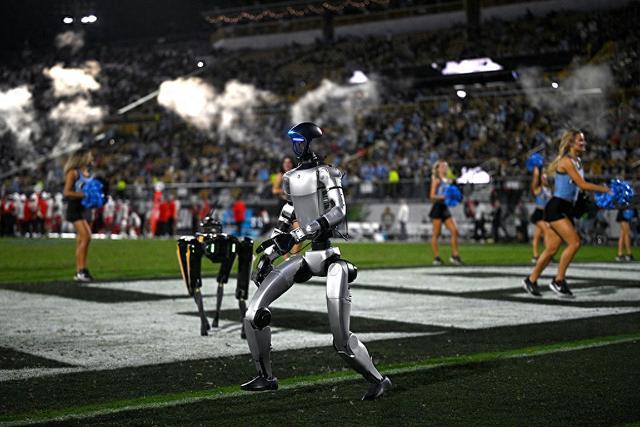 中国机器人在美国大学橄榄球赛上做展示。(视觉中国)