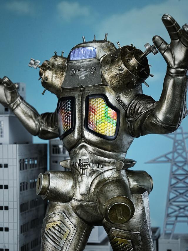 极简主义外观赋予其独特的未来感。设计师成田亨(同样设计了奥特曼的经典形象)摒弃了复杂装饰,采用大块面的银色装甲,仅以黑色条纹分割区域。其头部设计尤为精妙:没有传统意义上的“五官”,只有一对黄色发光体作为视觉传感器,一个红色发光体作为音频接收器,这种“去脸谱化”处理强化了其非人感与机械冷酷感。身体曲线也极少,多为刚硬的几何体组合,如肩部是标准立方体,腿部是圆柱体组合,这种“工业设计”风格使其在众多生物型怪兽中脱颖而出。