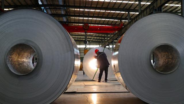 2025年2月24日,在山东省滨州市阳信县一家再生铝企业车间内,工人驾驶叉车搬运回收的废旧轮毂。 视觉中国 图