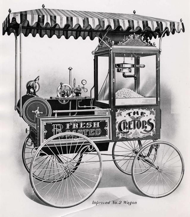 早在 3000 多年前驯化玉米的印第安人就已经掌握了做这种爆米花的技术,而将其推广成为一种全球性食品的则是一位名为查理斯·克里斯特(Charles Cretors)的美国人的功劳。在 1893 年查理斯改良了爆米花机将其小型化并装上了轮子,把这玩意儿带到了芝加哥世博会,之后爆米花摊就风靡于西方国家。