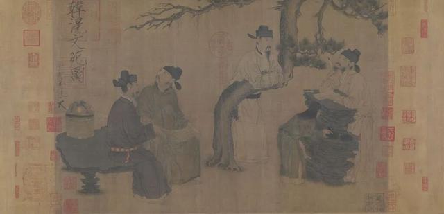 《文苑图》,五代,周文矩,绢本设色,描绘中唐时文人钱起、刘长卿等在琉璃堂宴集吟诗作文的场面,表现了当时文人生活场景。来源/故宫博物院