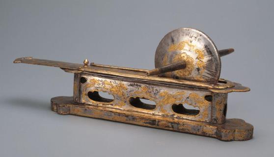唐鎏金鸿雁流云纹茶碾子,1987年出土于陕西宝鸡法门寺地宫。唐人吃茶先用茶碾将茶叶碾碎,然后将茶末冲饮。该茶碾通高7.1 厘米,长27.4 厘米,槽深3.4 厘米;辖板长20.7 厘米,宽3厘米,重1.168千克,整体银制纹饰填金,彰显中晚唐时上层生活中的奢靡风气。来源/法门寺博物馆
