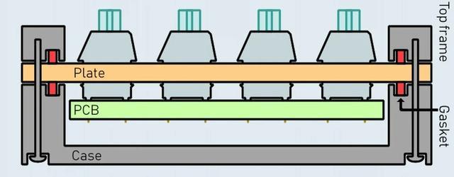 如果将轴体比作发动机,那么内部结构就是键盘的底盘和悬挂。如今最受追捧的Gasket架构(垫片结构)、就是通过在内胆与外壳之间加入弹性垫片,避免了金属与塑料间的硬碰硬,不仅令手感变得柔和且富有弹性,还过滤掉了细碎的共振杂音。