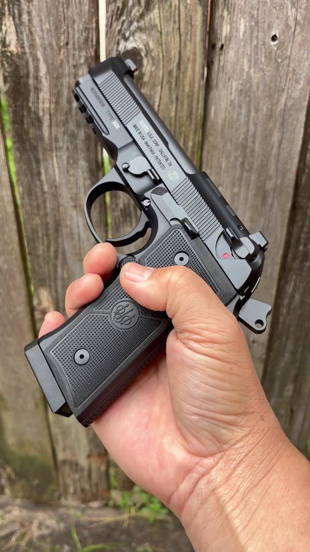 在操控细节上,92X适配了标准的9×19毫米鲁格弹,拥有15发或17发的大容量弹匣供弹系统。其最核心的进化在于采用了Vertec风格的直立握把设计,这种改变极大缩小了手部包络距离,使得不同掌型的射手都能获得极佳的指向性。