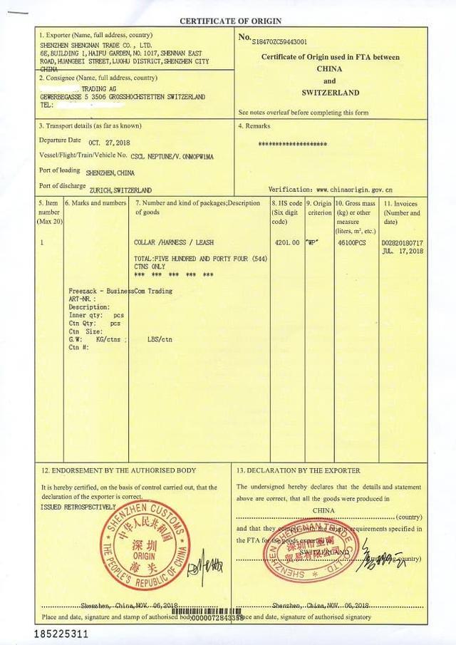 也就是货物原产地证明,证明这批机械 / 配件是中国制造。