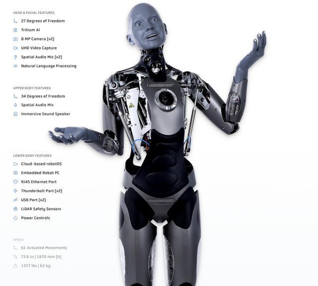 不同于传统机器人的僵硬面部表情,Ameca能够通过分布在面部的数十个高精度执行器,模拟出包括疑虑、惊讶、厌恶甚至微妙的幽默感在内的复杂表情。
