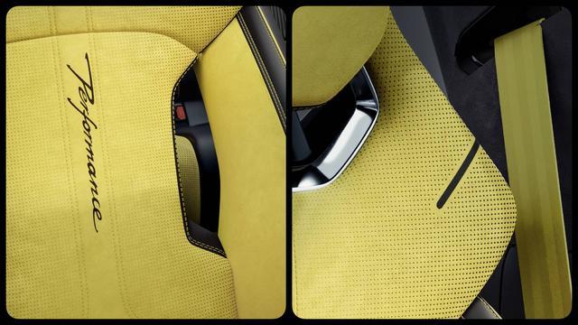 领克 10+ 的车内氛围还要更极致一些,内饰大面积包裹了 Ultrasuede 翻毛皮,配合专属的脉冲黄配色和赛道元素打孔图案,把视觉表现做了出来。