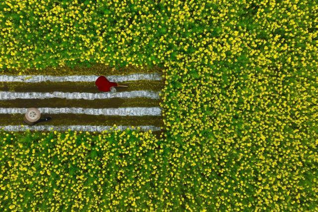 4月4日,游客在江苏省兴化市千垛景区赏花游玩(无人机照片)。新华社发(周社根摄)