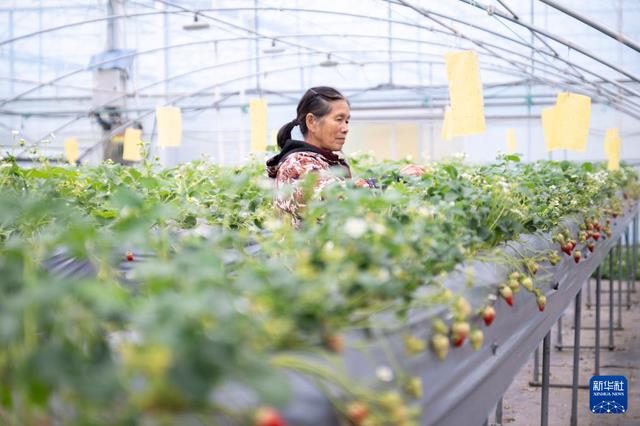 3月18日,工作人员在杏福农业生态园采摘草莓。新华社记者 伍志尊 摄