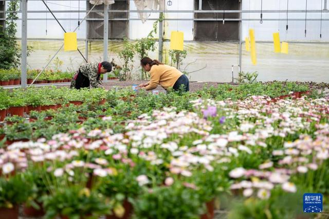 3月18日,工作人员在杏福农业生态园里养护鲜花。新华社记者 伍志尊 摄