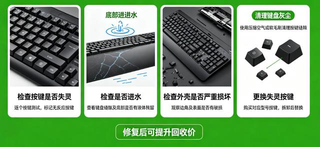 提醒大家,卖旧键盘的时候,要注意检查键盘的状态。如果按键失灵、键盘进水、外壳严重损坏,回收价会大打折扣,所以出售前,最好简单检查一下,能修的简单修一下,比如清理键盘里的灰尘、更换失灵的按键,这样能卖个好价钱。