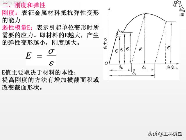 刚度是材料抵抗弹性变形的能力,核心评价指标是弹性模量 E。这里要纠正一个新手常踩的坑:很多人以为热处理能提升刚度,实际上 E 值只由材料本身的化学成分和晶体结构决定,热处理、冷变形都几乎无法改变它。工程上想要提升零件刚度,只能通过增加横截面积、优化截面形状实现,是精密仪器、机床主轴等零件设计的核心指标。