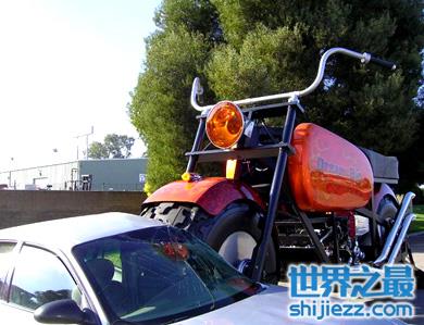 怎么?够大吗?和一辆大卡车有一拼了。究竟谁能开动这东西?姚明?能想像一下,如果力气不够大,扶不住的话,那么一条腿就算废了。前轮后面还有个梯子状的车架,后面也有小轮子进行平衡作用。只要不进行漂移,估计是倒不了,可以当开汽车的去开它。