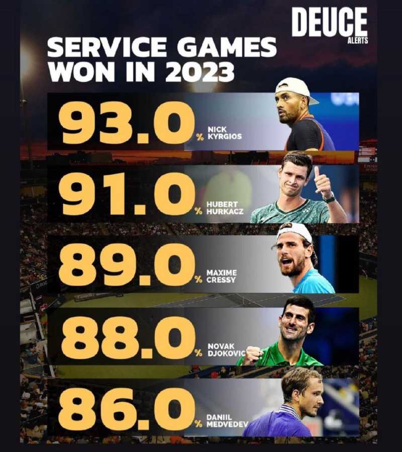 德约科维奇的发球不是最快的,却非常高效。他有很强的力量,他的发球变化多端,在平分区和占先区都能发出角度非常大的外角球,他也可以发出落点在T点附近的美式上旋(Kick Serve)。