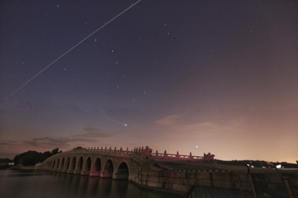 ↑2021年9月1日,中国空间站与颐和园十七孔桥“同框”。邓忠 摄