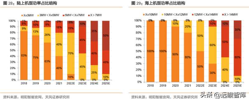 因此我们假设,陆上机型:2022 年 3MW 及以下的机型招标量占 10%,到 2023 年该机型 停产,2022 年 7MW 以上机型招标量占比 5%,到 2025 年占比预计会提升到 50%。海上机 型:2022 年 10MW 与 10-12MW 机型各占 50%,到 2025 年 14MW 以上机型占比达到 30%, 12-14MW 机型占比达到 60%。