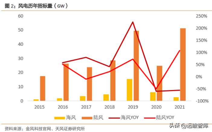 分海风和陆风来看,2015-2021年海风招标量占总招标量比例分别为6.42%、6.69%、12.50%、 14.33%、23.93%、20.26%、5.15%,2015-2020 年五年时间占比提升了 13.84pct,可以发现海风招标量的占比呈明显的提升趋势(19、20 年受到一定抢装潮的影响),但从经济性角度来看,海风还未像陆风一样实现平价,2021 年招标量占比出现了一定的回落,但我们认为后续海风招标量占比或将逐渐回升。