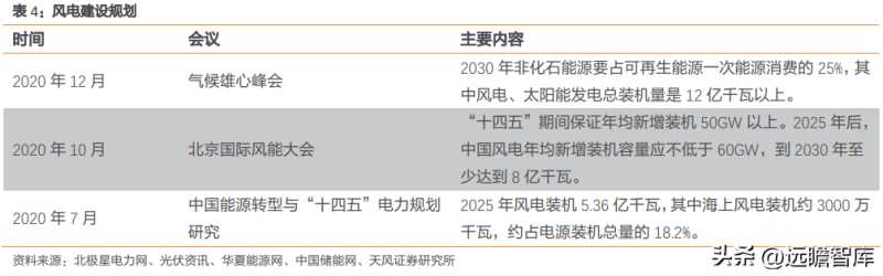 “十四五”期间风电年均增长装机容量有望超 50GW:在 2020 年的气候雄心峰会上,中央提出要在 2030 年风光总装机量达到 1200GW,是 2020 年底的累计装机容量的两倍有余(2020 年底伏累计装机达到 252.5GW,风电累计装机达到 281.72GW,风光累计装机 总容量 534GW)。根据《风能北京宣言》,“十四五”期间保证年均新增装机 50GW 以上, 以 2020 年的累积装机容量 282GW 来计算,2025 年累计装机容量将不低于 532GW。根据 全球能源互联网发展合作组织,2025 年风电装机将达到 5.36 亿千瓦,约占电源装机总量 的 18.2%,其对应年均新增装机容量也略超 50GW。