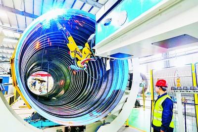 江苏中远海运特种装备制造生产车间,工人正在进行LNC罐箱生产。资料图片