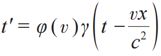 ,以及坐标变换公式:x '=φ(v)γ(x-vt),再通过引入第三个坐标系的办法,简单明了地证明了φ(v)=1。这样,爱因斯坦就从最基本的刚体运动学的角度,完整地建立了洛伦兹时空变换式。接着,作为洛伦兹时空变换式的应用,爱因斯坦给出了长度收缩、时间膨胀以及速度加法定理等结果。