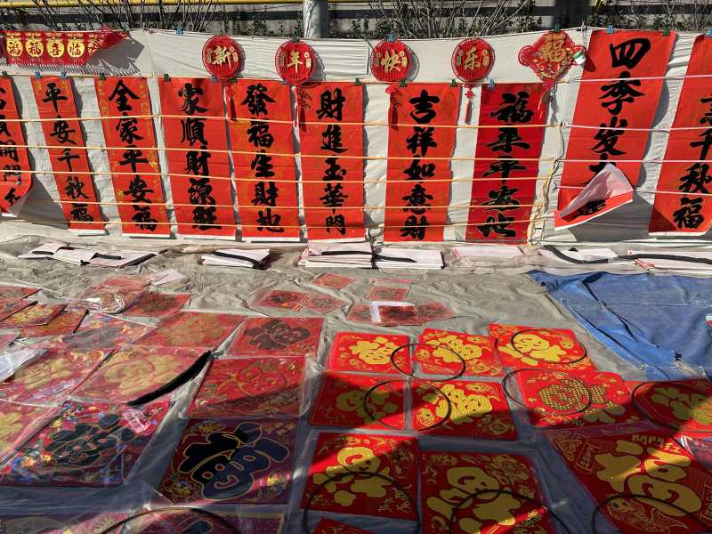 春节的另一个年味春联也要安排上。年集上有许多卖春联的摊位,他们将福字、年画铺在油布上,乡亲们一目了然。春联则是挂在商贩背后搭起来的临时展板上展示。春联的内容多以喜气祝福为主,如“宝地财源广,家和万事兴”“福来平安地,财进玉华门”等。