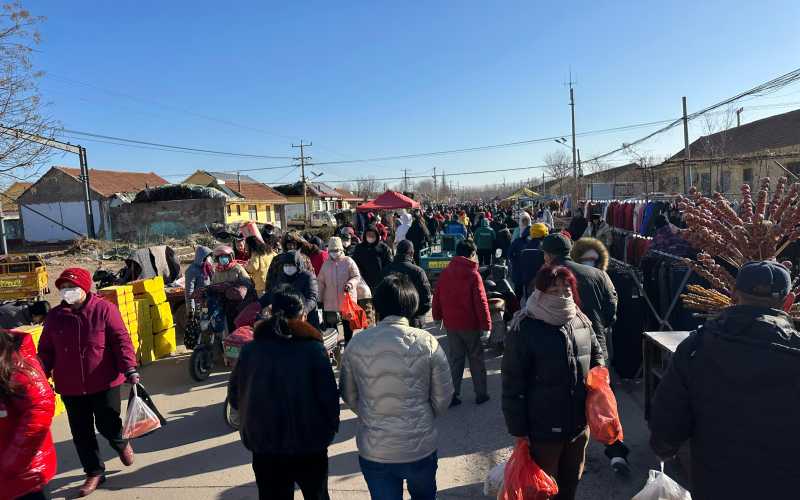 除了碗盘、芝麻秆、春联,小周与父母还买了诸城烧肉、各类蔬菜、新鲜水果等。年集上随处可见购买年货的乡亲,人群来来往往,随便向远处一看,便是攒动的人影。