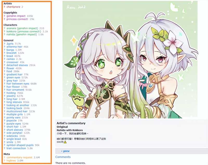 为了方便搜索,他们常会给图片打上非常细致的 tag,以下面这张游戏同人图为例,上传者不仅会打上角色名称、游戏出处,还会具体至画面内角色的发型、发色、姿态和衣着等细节。
