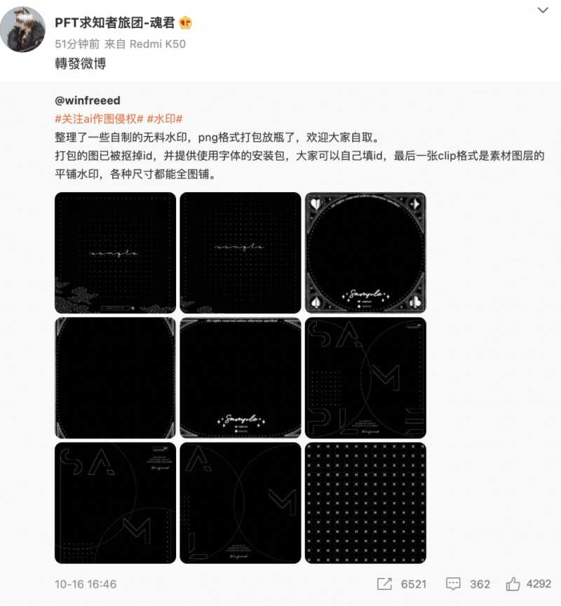 魂君在自己的倡议中提出一个思路:今后画师们在平台上发布作品时,可以在作品上覆盖大面积水印,破坏作品的完整性,以防止被用于训练 AI 以及洗稿。一些画师随之响应,开始分享水印的资源包。不同于签名似的小型水印,这些水印面积巨大,试图均匀地覆盖整个画面。