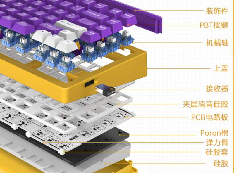 这款键盘不仅采用了 弹性PC定位板 ,并且在 定位板 及 PCB 直接还加了一层 消音硅胶 ,大大减少了 空腔音、杂音 。更关键而且精妙的,是PCB上下两边分辨延伸出的 T型弹力臂 ,配合两端的 硅胶套 ,将 轴体-PCB结合层 架空在 上下外壳之间 ,实现了 特别软弹,手感极佳 的 Gasket结构 。