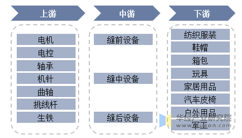 缝制机械行业上游为零部件和原材料行业,包括电机、电控、轴承、机针、曲轴、挑线杆、生铁等。缝制设备按缝制工序先后可分为:缝前设备、缝中设备和缝后设备。缝前设备主要包括裁床、铺布机等用于裁剪、铺开布料等缝纫前道工序的加工设备;缝中设备主要包括平缝机、包缝机、绷缝机和特种机等用于缝纫工序的加工设备;缝后设备主要包括熨烫、包装设备等用于熨烫、包装等服装生产后道工序的机械设备。下游方面。服装、家纺、产业用纺织品等纺织服装产业是与缝制机械行业关联最紧密的应用领域。