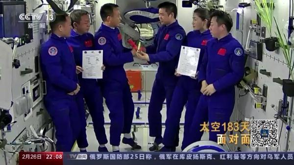 离别的日子很快就到了,离别之前,一场特殊的交接仪式在中国空间站举行。12月2日晚,神舟十四号、神舟十五号乘组进行了工作交接,6名航天员分别在确认书上签字。随后,陈冬向神舟十五号乘组指令长费俊龙移交了中国空间站的钥匙。