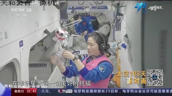 刘洋:我带了一幅照片的卷轴,上面是和我们以前飞行员战友的合影,跟家里人的合影,还带上去了小娃娃,挂在我的睡眠区门口,还带上去了一个幸运星的瓶子。我每天都会叠一颗幸运星,在幸运星上写一句美好的祝福,每一天放在那个小瓶子里面,183天就叠满183颗。