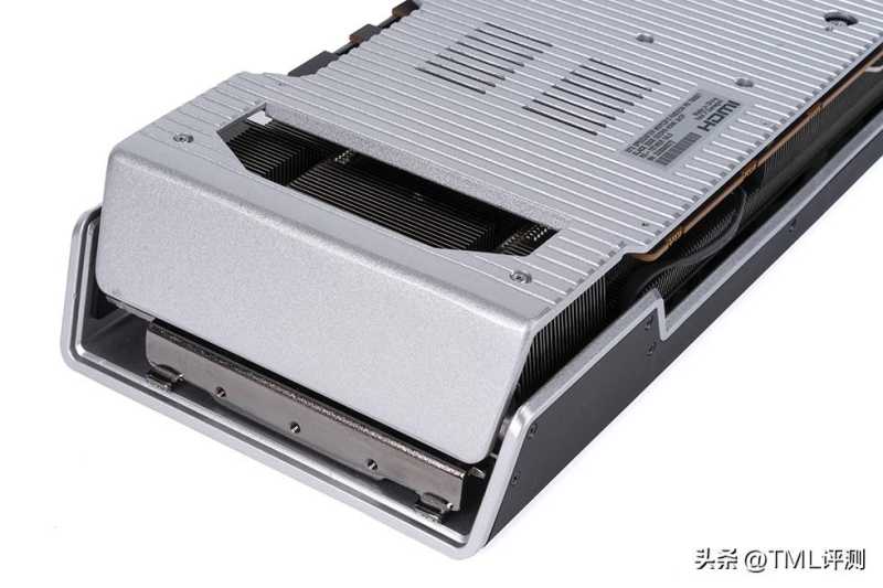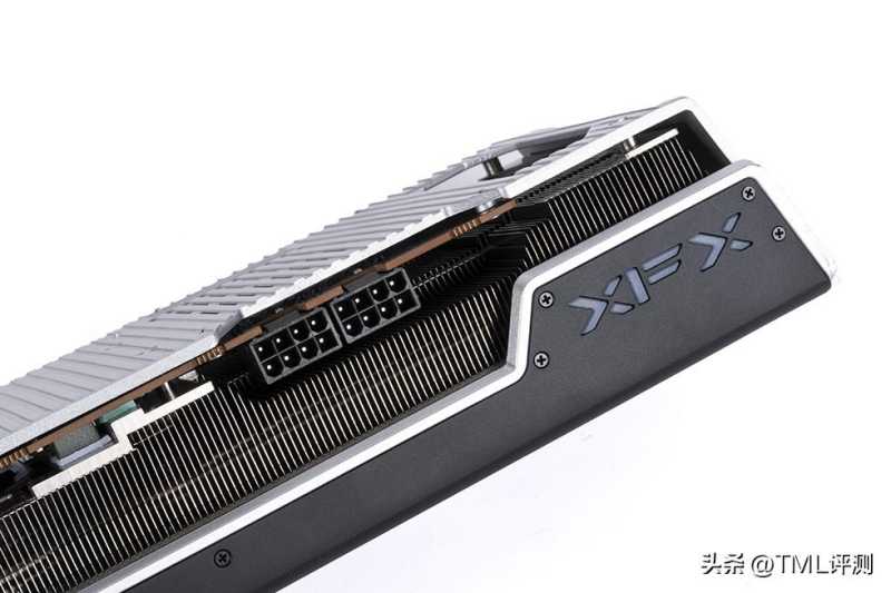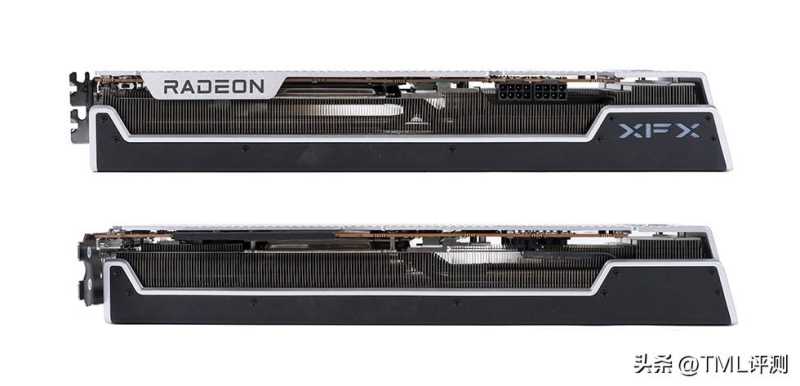 从侧面可以看到XFX RX 7900 XT 20GB 海外版pro显卡配备了大面积的散热鳍片,鳍片高低交错排布,散热鳍片下隐藏着8根6mm厚的加长复合热管,采用全镀镍工艺,贯穿整个散热器,确保散热效能最大化。