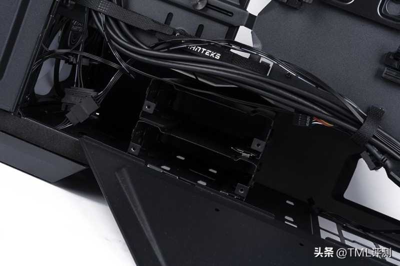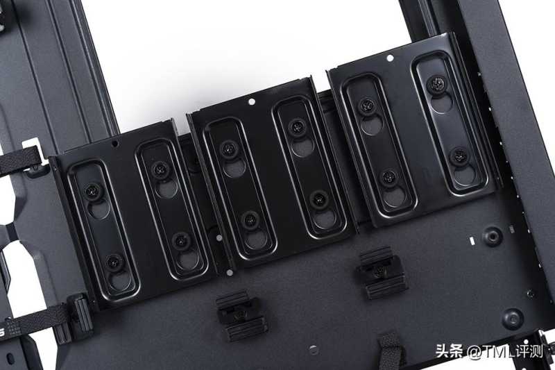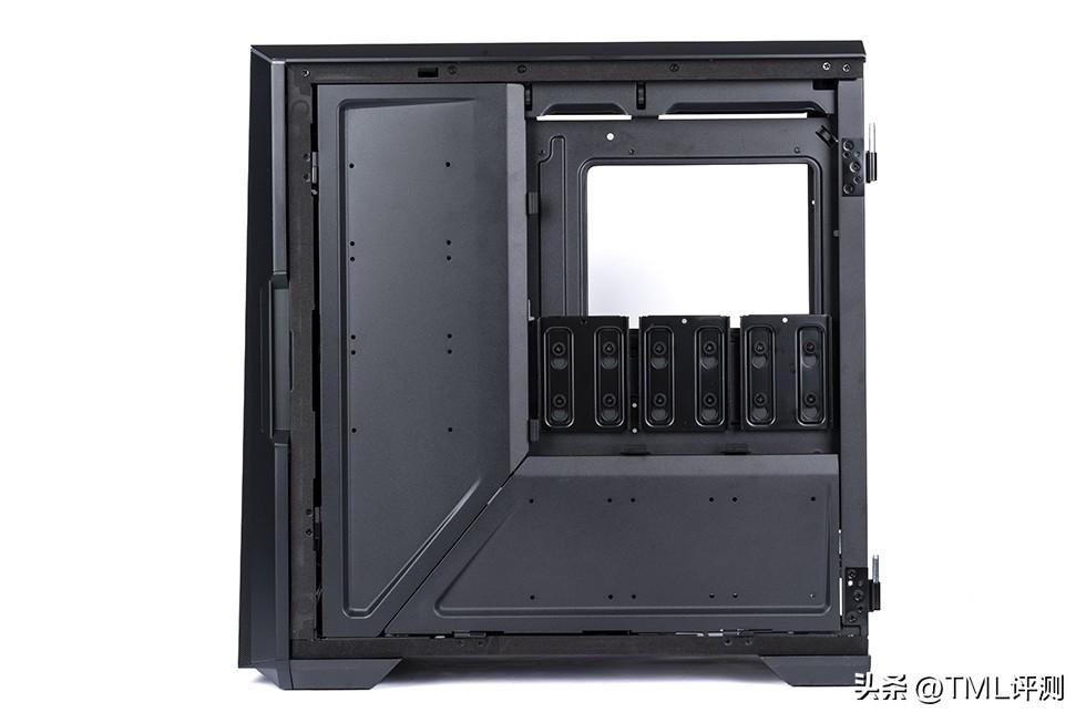 打开盖板后可以看到左侧宽大的理线空间,双排理线魔术带,33mm的北线空间,再多的线也无需担心。右侧主板安装位下方提供了 3 块 2.5 寸硬盘的安装位,加上两侧盖板的 6 块,背部共计支持 9 块 2.5 寸硬盘的安装。