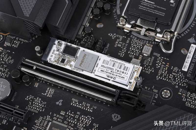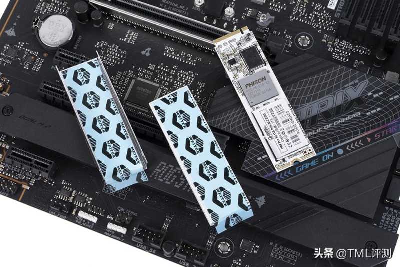 存储方面,选用影驰名人堂HOF PRO 30 PCle 4.0 1TB采用标准2280规格,白色PCB。正中央位置为PHISON群联PS5016-E16主控芯片,作为群联推出的全球首款消费级PCIe Gen4x4 NVMe主控芯片,28nm制造工艺,双核Cortex-R5处理器,8个NAND通道和32个CE,内部集成智能温控和多种数据纠错机制。在正反两面的型号贴纸下,分别布置了4颗来自东芝,型号为TA7BG95AYV的3D NAND TLC颗粒。