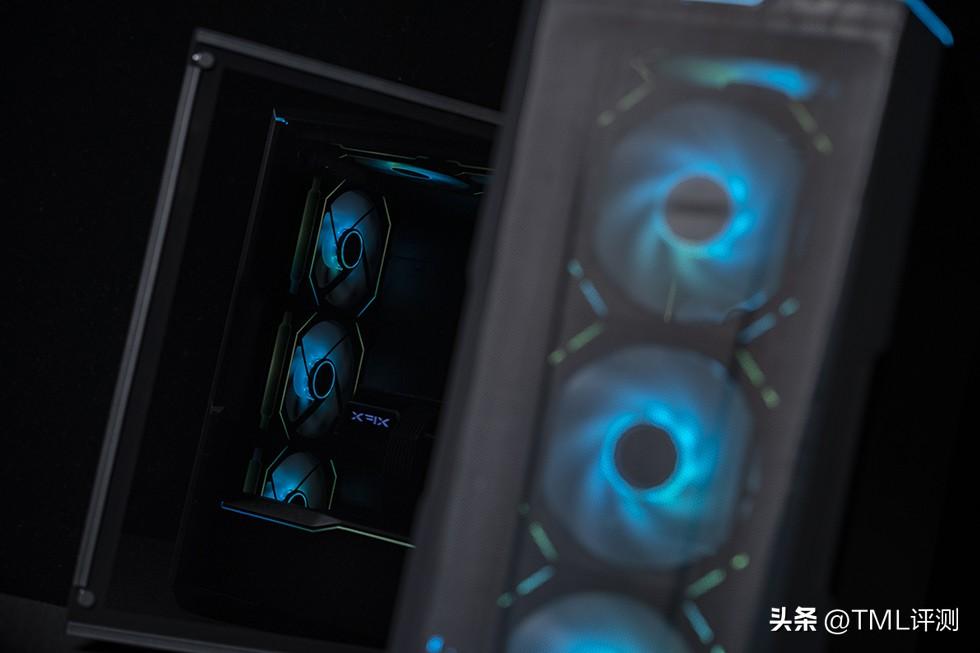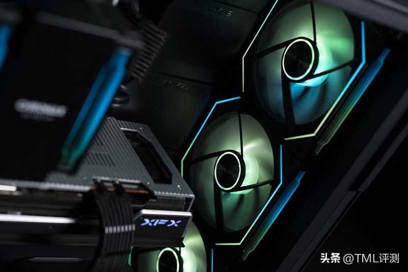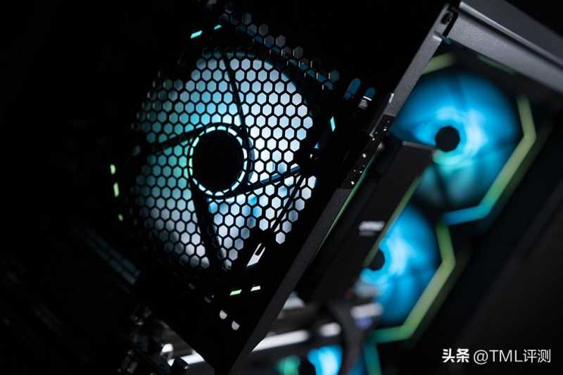 追风者 G500A 搭配7把140mm规格的SL-INFINITY积木风扇,大面积散热通道极大提升了散热效能,正面板顶部和电源仓棱线位置的线性LED灯效和联力SL-INFINITY积木风扇扇框两侧内缘的LED灯条又形成了呼应,搭配青绿色的led灯效,整体性能和感官都达到了预期的效果。