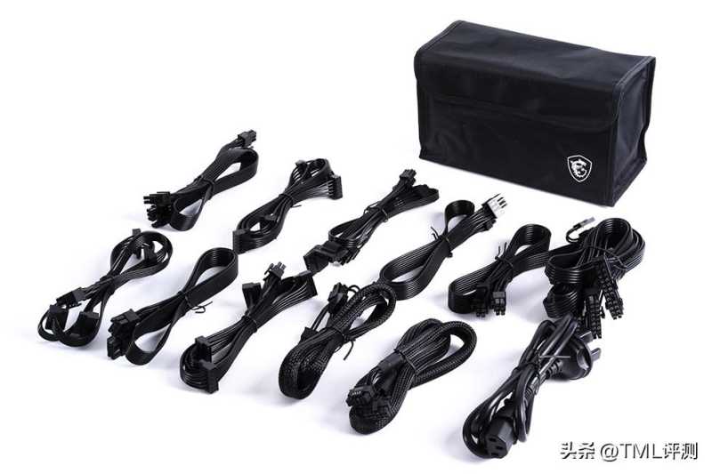 随机的搭配模组线,其中1条24Pin主板供电线,2条4pin CPU供电线,1条大4D供电线,2条6+2pin PCIE供电线,2条SATA供电线均为扁平线材,1条16pin的12VHPWR供电线和1条由12VHPWR转6+2pin PCIE供电线为包网线材。