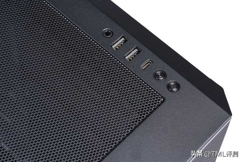 前置I/O及按钮布置在机箱顶部右前侧,从上到下分别是音频接口、2个USB 3.0 Type-A、1个Type-C、2个灯光控制按钮。