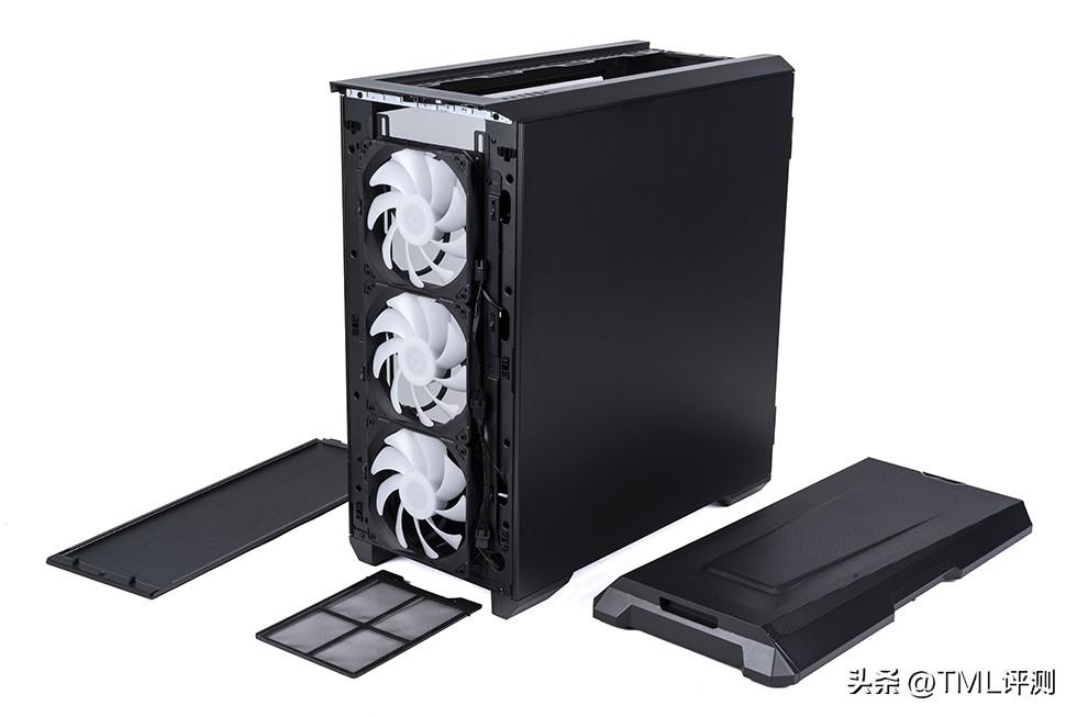 机箱正面 为Mesh 网孔金属面板,1mm 网孔提高透气性和防尘效果,拆开后可以看到内部增加嵌入式冷排位,配置了三枚追风者自家的 M25 140 ARGB 进风风扇。