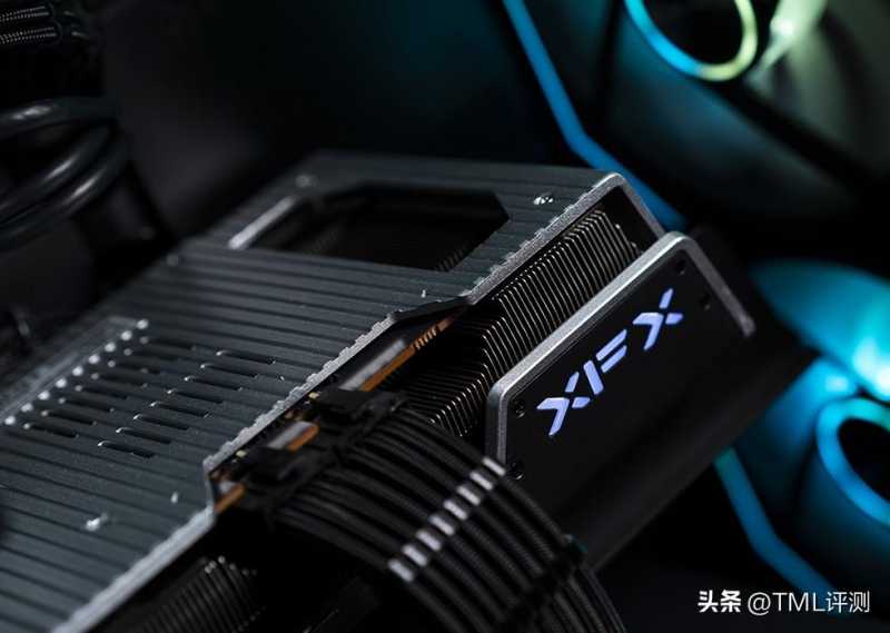 XFXRX 7900 XT 20GB 海外版pro 显卡的TDP为300W,供电接口采用的是双8Pin,在显卡尾端带有XFX的LOGO,通电后会亮起。