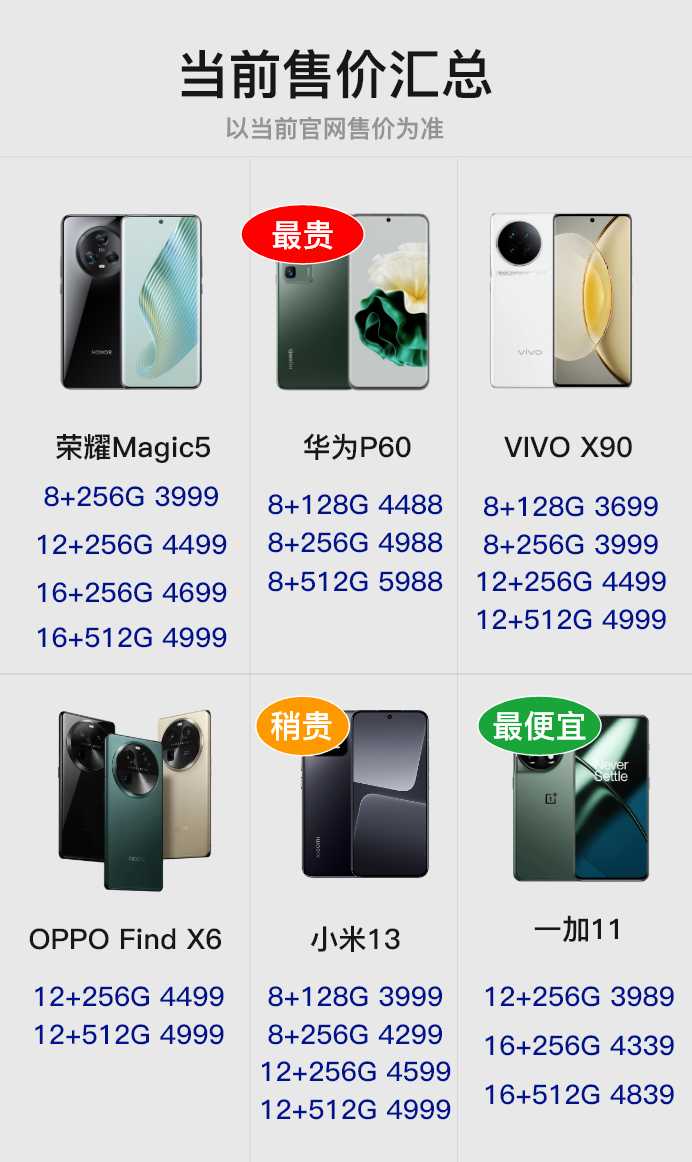 VIVO:VIVO X90系列小米:小米13系列一加:一加11OPPO:OPPO Find X6系列华为:华为P60系列荣耀:荣耀Magic5系列这些系列大多都分为标准版和Pro版,其中售价更低的标准版大多都是走量机器,是最适合大多数消费者选择的版本。