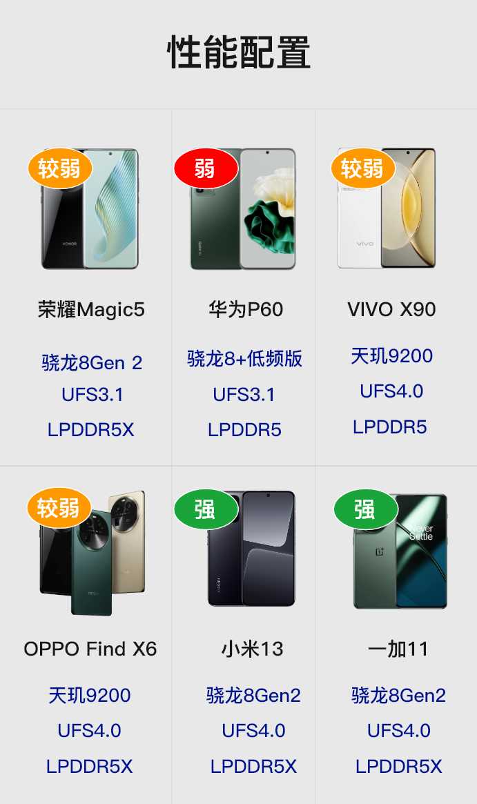 其中综合配置比较突出的是华为P60以及OPPO Find X6。