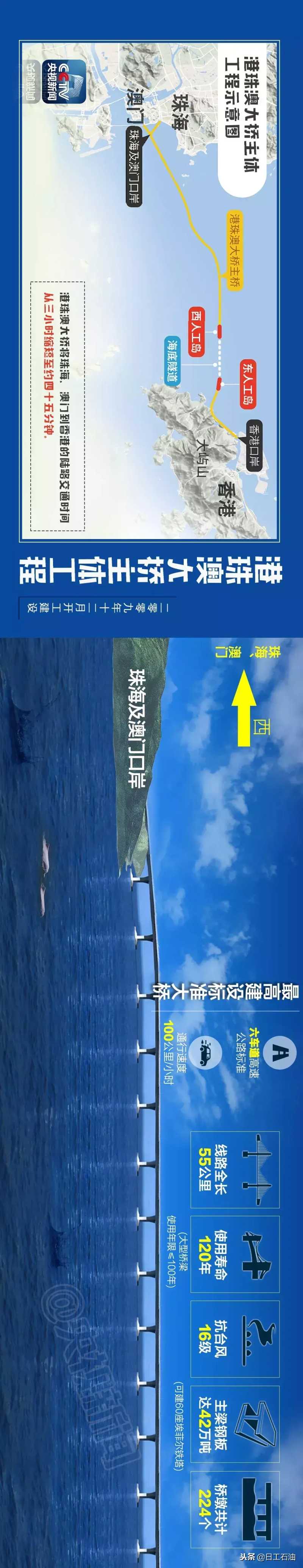 港珠澳大桥全长55公里,是中国第一例集桥、双人工岛、隧道为一体的跨海通道。