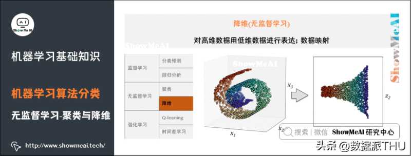 无监督学习(Unsupervised Learning):训练集没有标记信息,学习方式有聚类和降维。