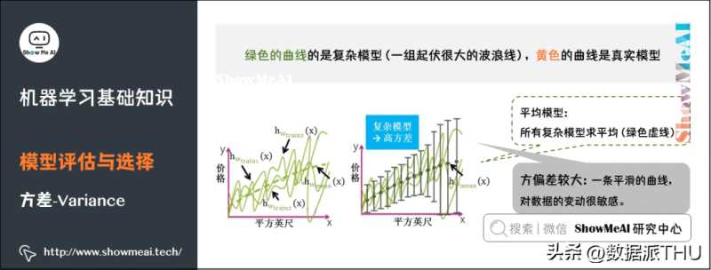 复杂模型的对应的函数千奇百怪,毫无任何规则,但平均模型的函数也是一条平滑的曲线,因此复杂模型的方差很大,并且对数据的变动很敏感。
