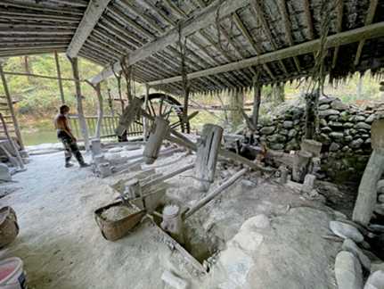 瑶里的绕南龙窑遗址,如今还能看到正在工作的水车和水碓。当地人通过修建水坝,让水形成势能,势能带动水车,水车转动木轴,木轴带动水碓,水碓起起落落,瓷石粉碎成土。
