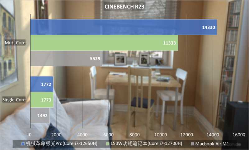 在检测CPU基础测试中,可以看到Cinebench R23上的单线程和多线程表现,不仅优于同时期的Apple M1,也比150W功耗笔记本的Core i7-12700H强力不少,也足以见得机械革命极光Pro已经很好掌控了这块CPU的特性。