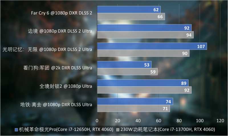 基础测试的优秀表现同样也延续到实战中。按照惯例我们先对早期支持DLSS 2.X和DXR游戏进行测试,同时也找来一款笔记本作为陪跑,需要注意的是笔记本之间的设定和定位是有差距的,这里仅用作性能对比参考。