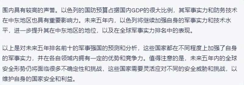 未来五年内,以色列将继续加强自身的军事实力和技术水平,进一步提升其在中东地区的地位,以及在全球军事实力排名中的表现。