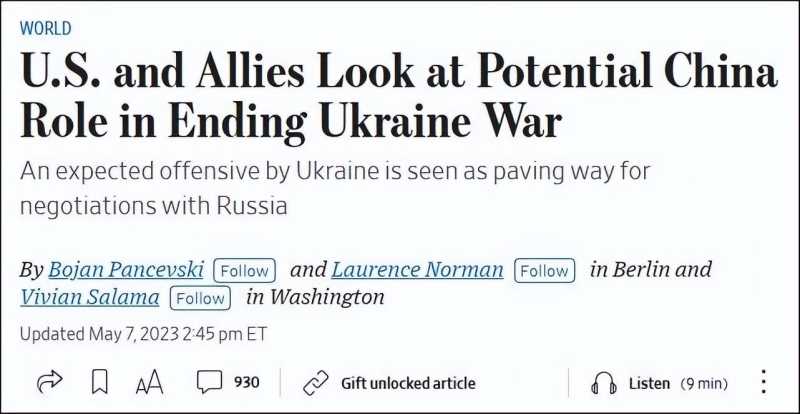 随着俄乌冲突时间的延长,各方似乎都开始寻求和谈解决危机,但仅靠俄罗斯与西方之间的谈判显然已不足以推动战争结束,此时中国开始显现出特殊意义。援引《华尔街日报》报道,近段时间已有美国与欧洲官员表示中国在俄乌和谈中可发挥的作用受到瞩目。美国国务院副发言人韦丹特·帕特尔在例行记者会上甚至表示“中国能够扮演适当的角色”,与之前相比,西方,特别是美国的思维方式发生了明显转变,将中国视为解决俄乌冲突的一个关键点,而这种转变或与两点有关。